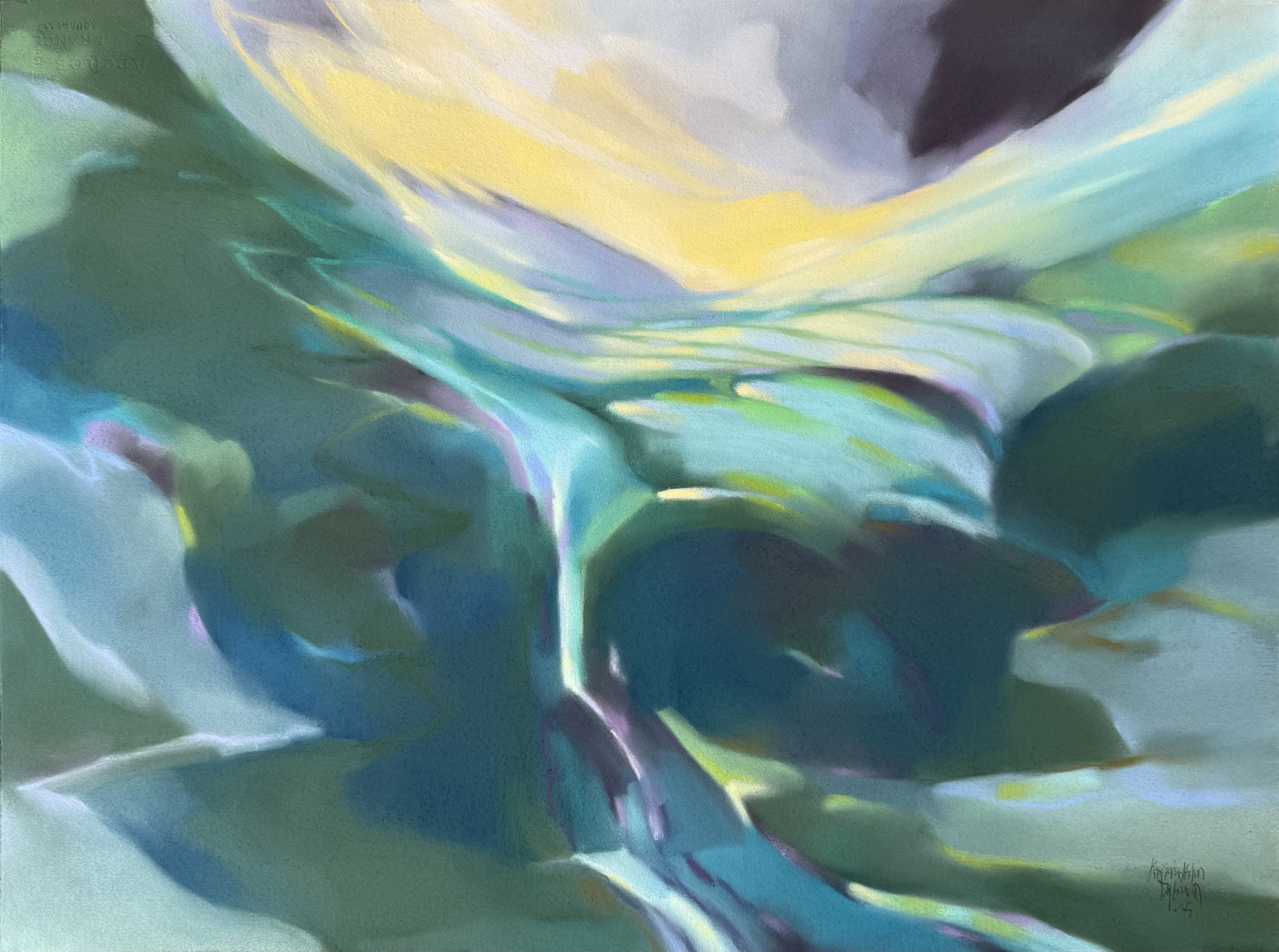 I like to revisit a specific place in my mind, translating the atmosphere it into a lyrical landscape with the use of colour. The abstraction allows me to incorporate the whole experience; incorporating the scent of warm earth, the sound of running water and whispers of wind. The landscape is dissolved and translated it into a colour mood and in this matter given a closeness to the soul.