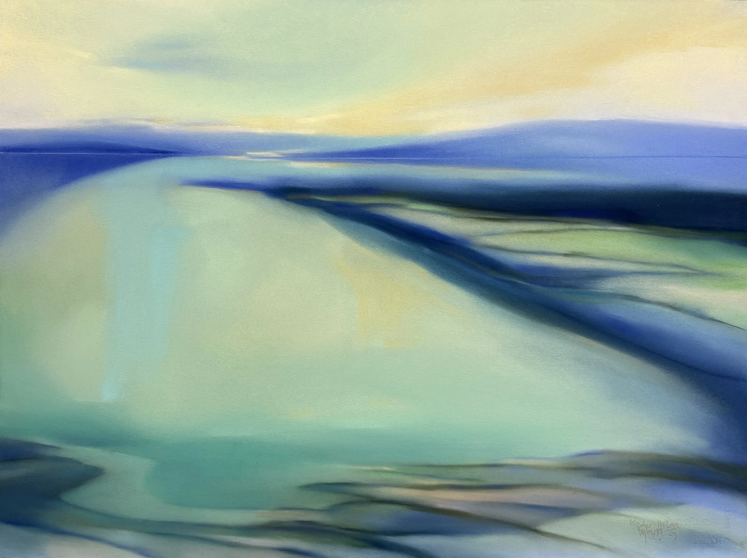 The work unfolds within a liminal moment—an interstice between day and night. The fjord rests in near stillness as the gaze travels outward toward distant islands at the edge of the horizon. During the blue hour, light transitions gradually from yellow to blue, dissolving into a turquoise-green resonance that binds sky and water into a single field. Time appears suspended. What remains is a quiet, contemplative pause before darkness slowly settles, softening and obscuring the landscape.