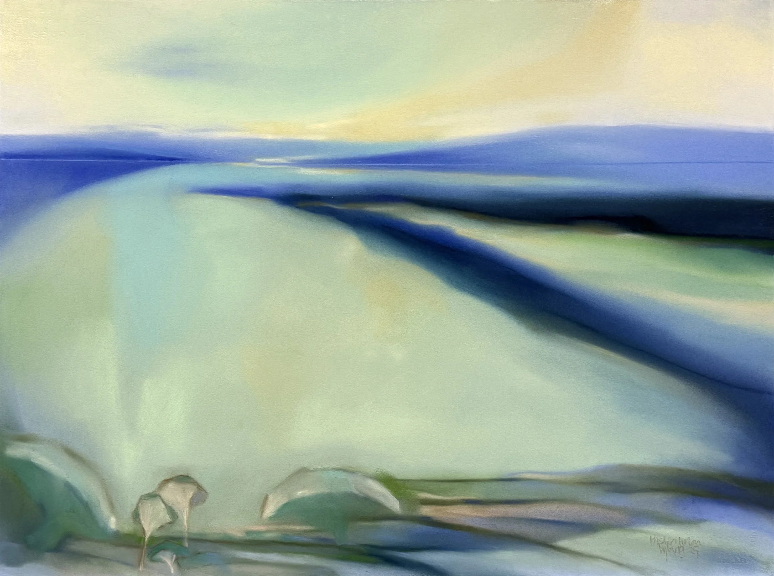 I like to revisit a specific place in my mind, translating the atmosphere it into a lyrical landscape with the use of colour. The abstraction allows me to incorporate the whole experience; incorporating the scent of warm earth, the sound of running water and whispers of wind. The landscape is dissolved and translated it into a colour mood and in this matter given a closeness to the soul.