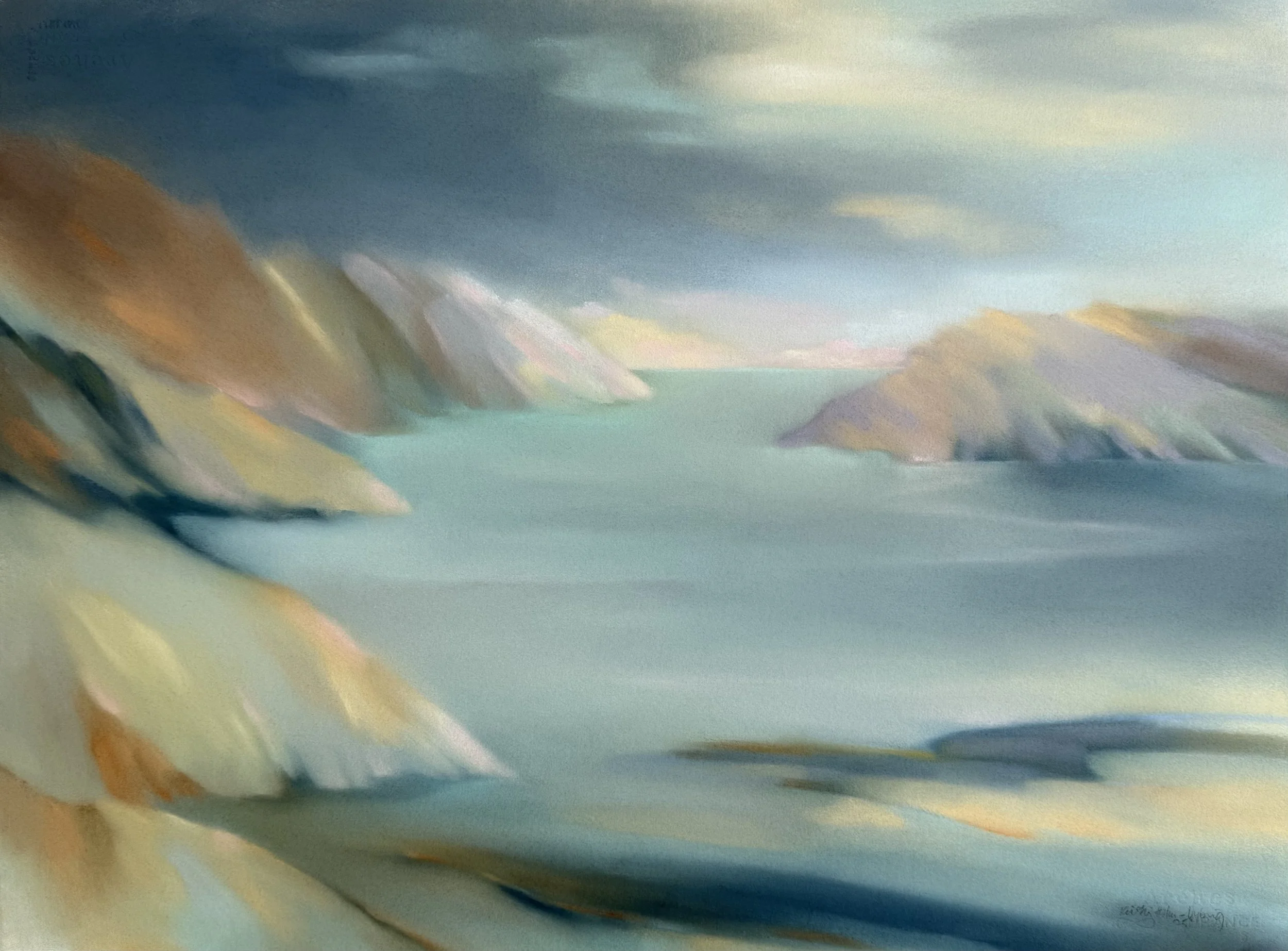 Recreating a landscape on paper is much like telling a story through cliffs and mountains and the different faces of water. The tale of majestic mountains and friendly slopes are told by dry pigments rubbed into cotton paper until the whole surface is filled with colourful pigments that‘s creating images of recognisable shapes and places remembered. But its more than that, its a tale of life itself; It’s a soulscape and a reflection on human emotions.