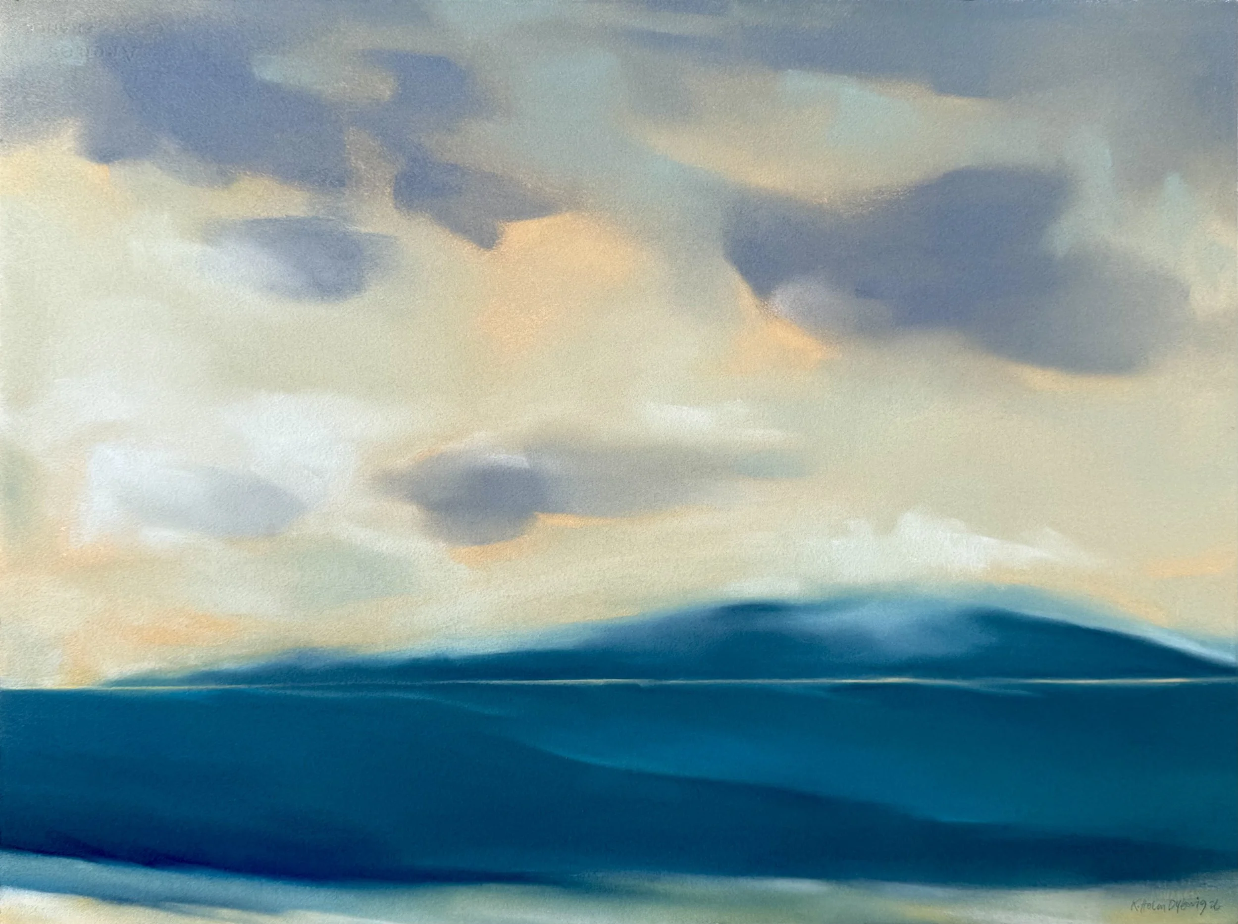 This artwork is made with soft pastels and has a fine layer of fixative as finishing coat. It has a delicate surface and needs the protection of glass. It ships flat in a box. It’s available from my studio.